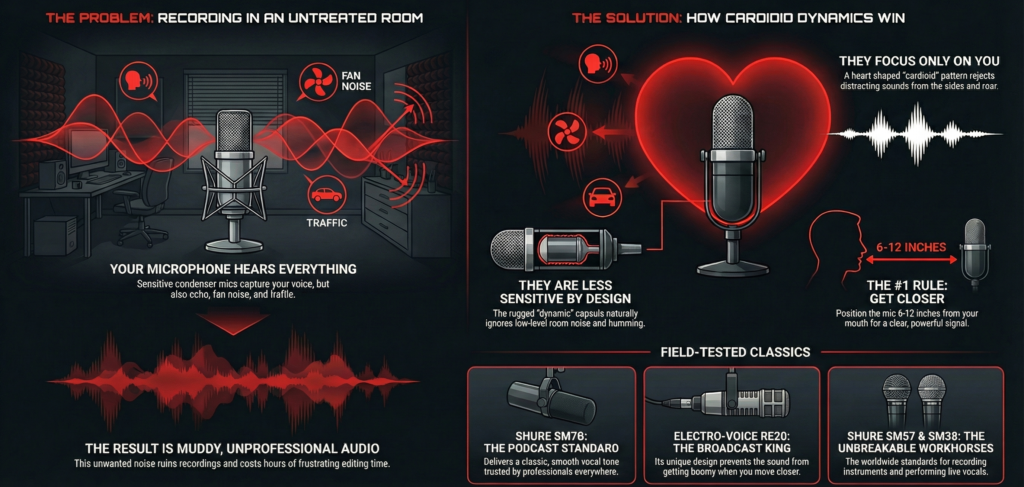 I learned this after ruining multiple vocal takes with condensers in untreated spaces. Traffic noise. Fan noise. Room echo. I switched to a dynamic mic and the problems stopped instantly.