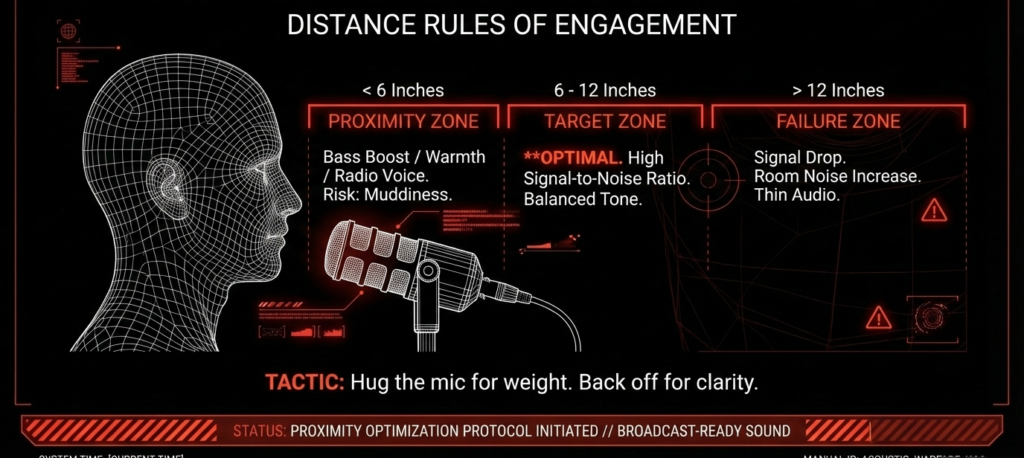 Keep it 6 to 12 inches from your mouth. Closer gives a clean, strong signal. Too close adds bass boom and plosives. Hug it slightly to make your voice rich and smooth.