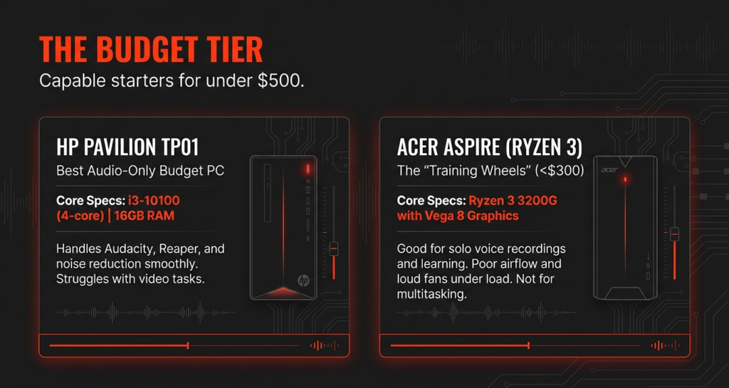 | Desktop | Acer Aspire Ryzen 3 3200G | Hobbyists on a Budget | Has Vega 8 GPU which helps in video/audio preview | ⚠️ Limited |