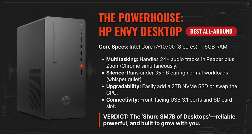 If you just want a straight answer: get the HP ENVY Desktop or the MacBook Pro. Both are quiet, powerful, and built for heavy podcast workflows. But let me break it down based on what you actually need 👇