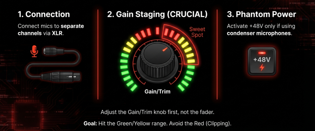- Gain Control: Adjust the gain or input level for each microphone if you want to get optimal signal strength without clipping or distortion.