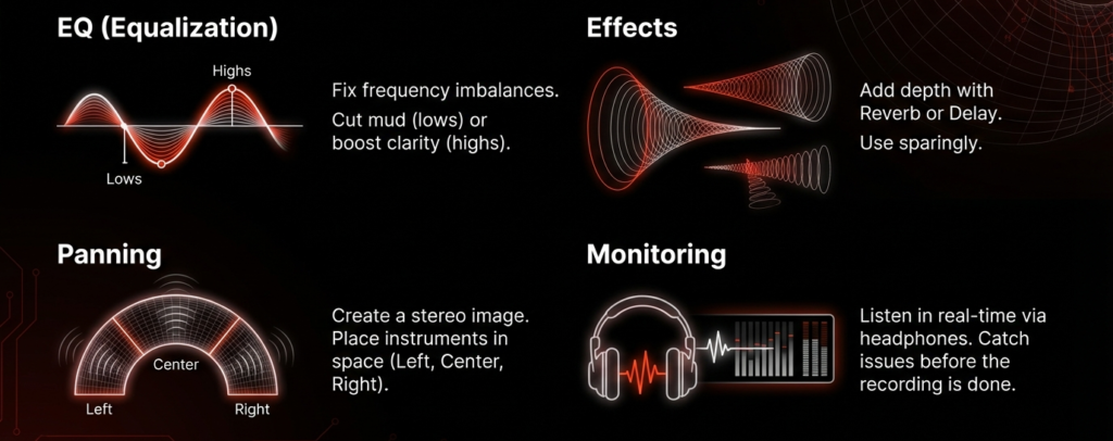- Monitoring: In order to make corrections and fine-tune during recording, I listen to the mixed audio in real-time using headphones or studio monitors.