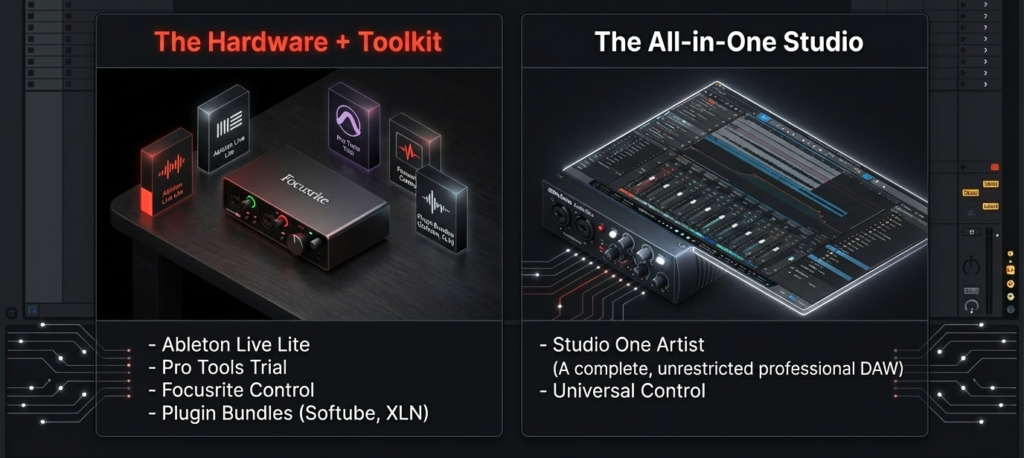 PreSonus usually wins for software ecosystem and bundled DAW value.