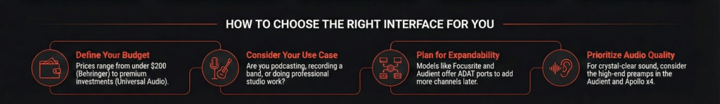 Now that we’ve broken down the top 4 XLR input audio interfaces and their unique features, it’s time to figure out which one is the best fit for your setup. Choosing the right interface isn’t just about specs—it’s about how the features align with your specific needs. Here’s what to consider: