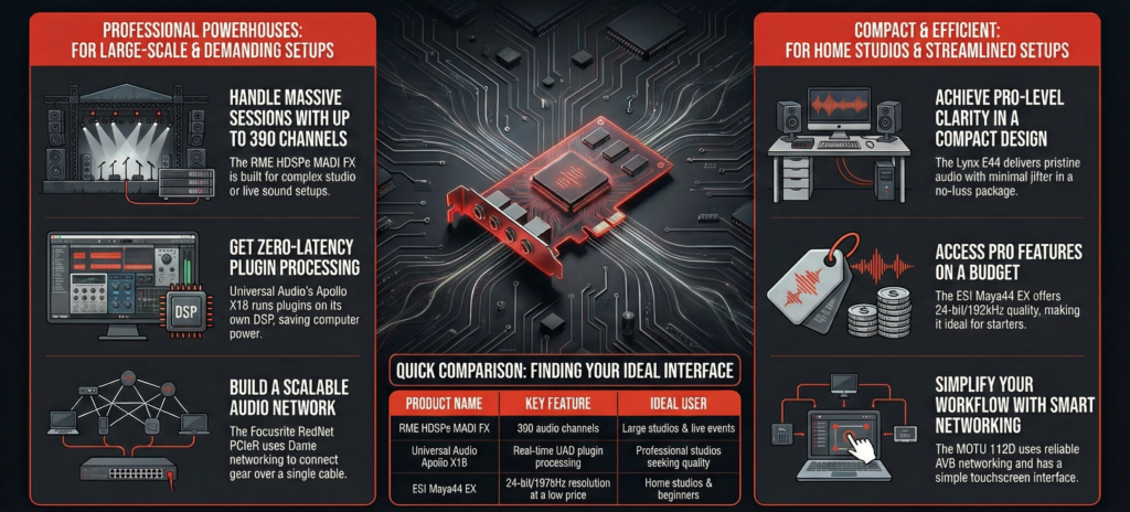 In this article, we’re diving into the top 7 PCIe audio interfaces on the market. We’ll break down what makes each one unique and how they can elevate your audio game. So, let’s explore the best of the best, and help you find the perfect fit for your needs!