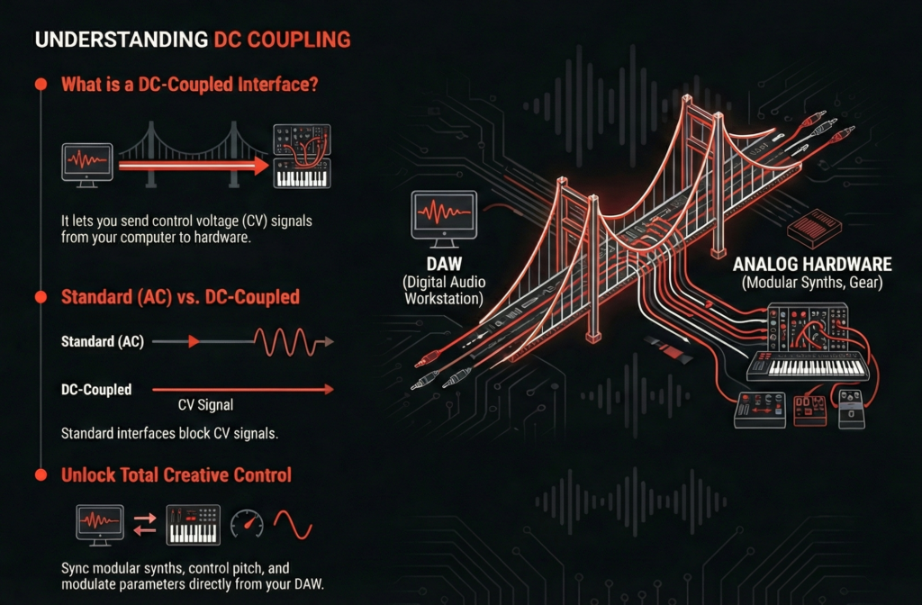 If you’ve ever wondered what makes DC-coupled audio interfaces such a big deal, let’s break it down. Most standard audio interfaces use AC coupling, which is great for typical audio signals but not so much for sending control voltages (CV). That’s where DC coupling comes into play.