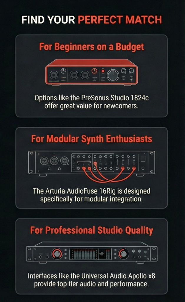 - For Modular Synth Enthusiasts: If you’re diving into modular synths and want an interface designed for that purpose, the Arturia AudioFuse 16Rig stands out with its modular synth integration, while the PreSonus Quantum 2626 offers ultra-low latency and flexibility for larger setups.